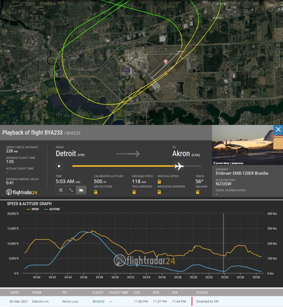 O incidente ocorreu durante o voo BYA-233 com destino a Akron. O voo partiu de Detroit à noite, um pouco depois das 22:30, no horário local.
