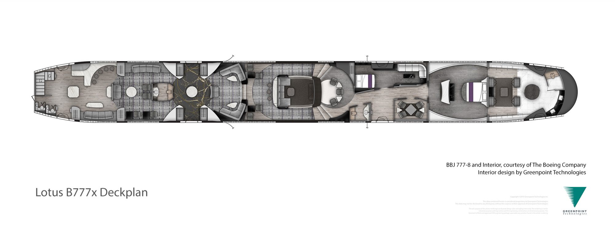 Além disso, a Boeing fechou uma parceria com a Greenpoint Technologies, empresa especializada no design de interiores de aeronaves, que desenvolveu um luxuoso projeto denominado Lotus para o interior do 777X.