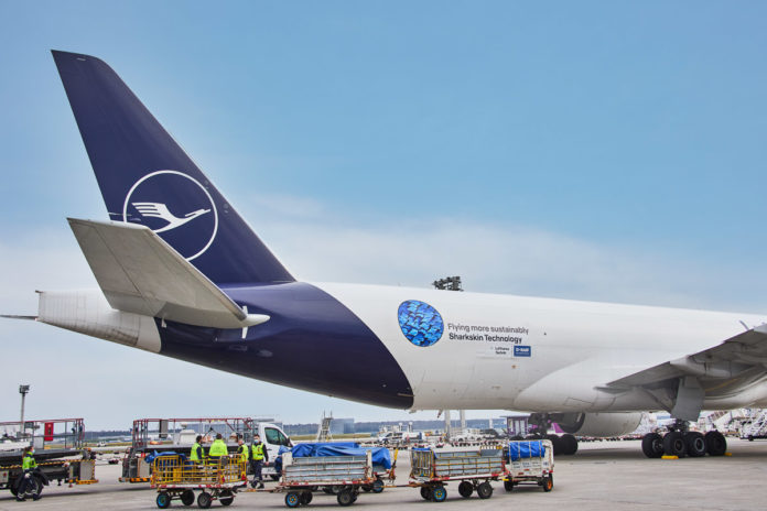 Os aviões Boeing 777 da Lufthansa Cargo receberão, no ano que vem, uma superfície altamente tecnológica imitando pele de tubarão. A tecnologia permite reduzir o arrasto aerodinâmico, reduzindo também o gasto de combustível, conforme anúncio da empresa ontem, 03/05.