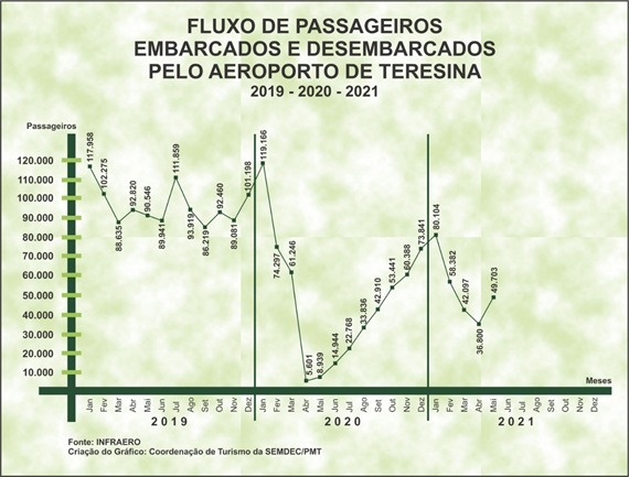 A Coordenação de Turismo da Secretaria de Desenvolvimento Econômico e Turismo (SEMDEC), da Prefeitura de Teresina, elaborou um gráfico com base em informações da Infraero que indica que o movimento de passageiros no aeroporto de Teresina sugere que esteja havendo uma recuperação do fluxo turístico.