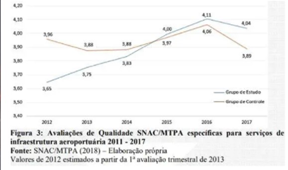 Gráfico mostrando melhora na qualidade dos serviços de aeroportos em concessão (linha azul)