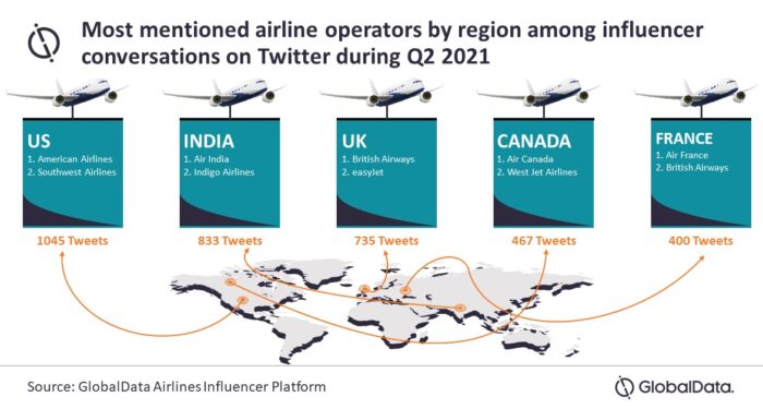 A plataforma GlobalData também mostrou quais são as aéreas mais comentadas por região. Nos Estados Unidos, a American Airlines ficou na frente, seguido pela Southwest Airlines. Na Índia, a Air India foi a mais comentada, seguida da Indigo Airlines. No Reino Unido, British Airways e Easyjet, respectivamente. No Canada, Air Canada e West Jet Airlines, respectivamente e, na França, Air France e British Airways, respectivamente.