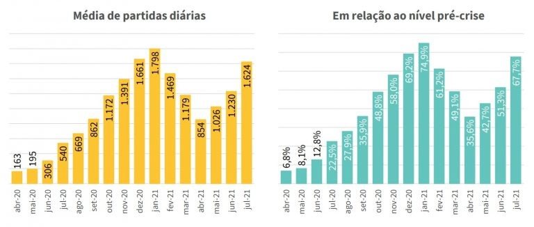 Julho é o terceiro mês consecutivo em que as companhias aéreas nacionais registram aumento na malha aérea doméstica. Neste período, foram registradas 1.624 decolagens diárias, o que corresponde a 67,7% da oferta de voos pré-pandemia, em março de 2020.