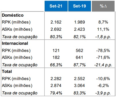 Já a capacidade doméstica (medida em ASKs – assentos oferecidos vezes quilômetros voados) aumentou 11,1% em relação a 2019. O número absoluto foi de 2,692 bilhões de ASKs em setembro deste ano, representando uma redução de 1,6% em relação aos 2,737 bilhões de agosto.
