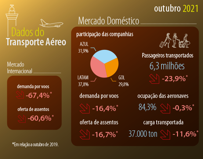 Ainda no mercado doméstico, a demanda, medida em RPK, e a oferta, medida em ASK, tiveram retração de 16,4% e 16,7%, respectivamente. Além disso 6,3 milhões de passageiros foram transportados no mês, representando cerca de 73& do total de embarques do mês de outubro de 2019. Com estes números, a ocupação das aeronaves foi de 84,3% no mês, apenas 0,3% abaixo do registrado no mesmo mês de 2019.