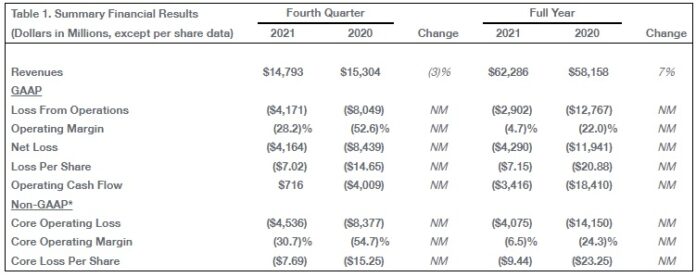 Dessa maneira, o prejuízo registrado pela companhia foi de 4,29 bilhões de dólares, ante o prejuízo de 11,94 bilhões de dólares em 2020.