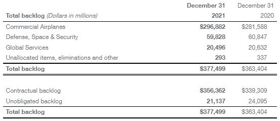 Em aviões comerciais, o 737 foi o que mais se destacou nas entregas, com 263 entregas em 2021, ante 43 em 2020. O restante das entregas se manteve com números parecidos exceto o 787, o qual apenas 14 unidades foram entregues, ante 53 de 2020.