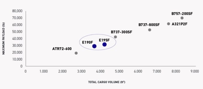 Os E-Jets convertidos em cargueiros terão cerca de três vezes mais autonomia do que os turboélices de carga atuais, além de 50% mais de capacidade de carga e custos de operação menores. O E190F pode transportar uma carga útil de 23.600 libras (10.700 quilos), enquanto o E195F pode transportar uma carga útil de 27.100 libras (12.300 quilos).