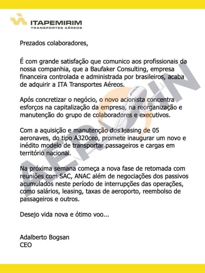 Ontem, 13, a Itapemirim emitiu um comunicado interno aos colaboradores anunciando que teria sido vendida a investidores. A mensagem é assinada pelo presidente da Itapemirim, Adalberto Bogsan.