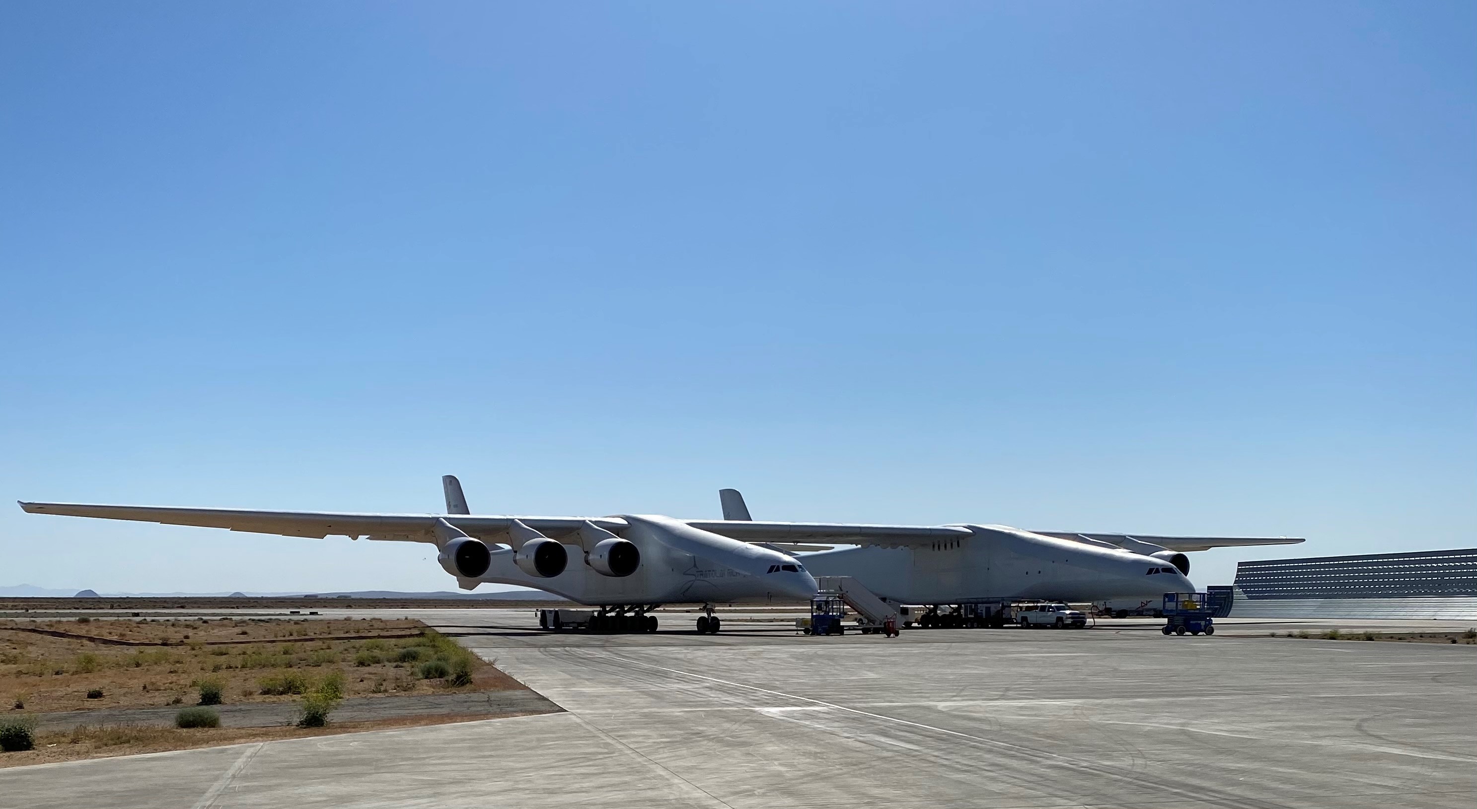 O avião de duas fuselagens tem 117 metros de envergadura. Além disso, ele possui 6 motores. O grandalhão será usado como plataforma de lançamentos voadora para veículos hipersônicos.