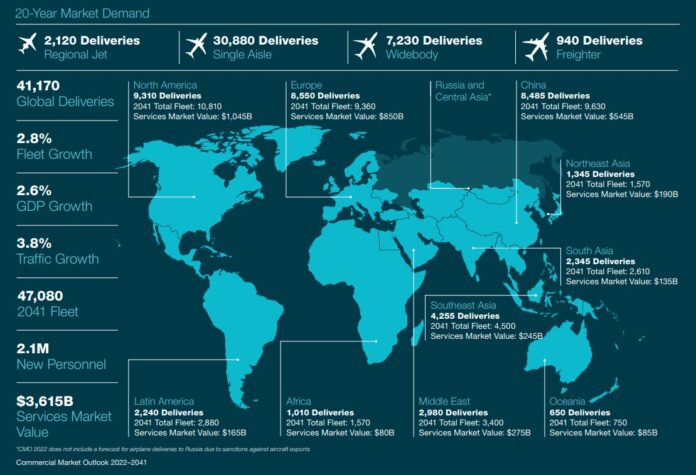 Mais especificamete, o “2022 Commercial Market Outlook” da Boeing mostra 2240 novos aviões na região até 2041. A Boeing afirma que o crescimento será impulsionado pelas rotas domésticas e intra-regionais.
