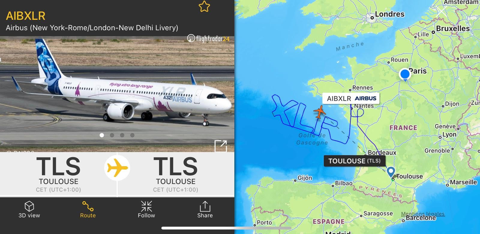 O avião decolou de Tolouse, sul da França em direção à Irlanda, depois em direção à Noruega, passando pela Alemanha, República Tcheca, Áustria e Itália. Depois voltou à sede da Airbus. Surpreendentemente, durante o voo, o avião fez uma rota de modo a escrever “XLR” sobre o litoral da França.